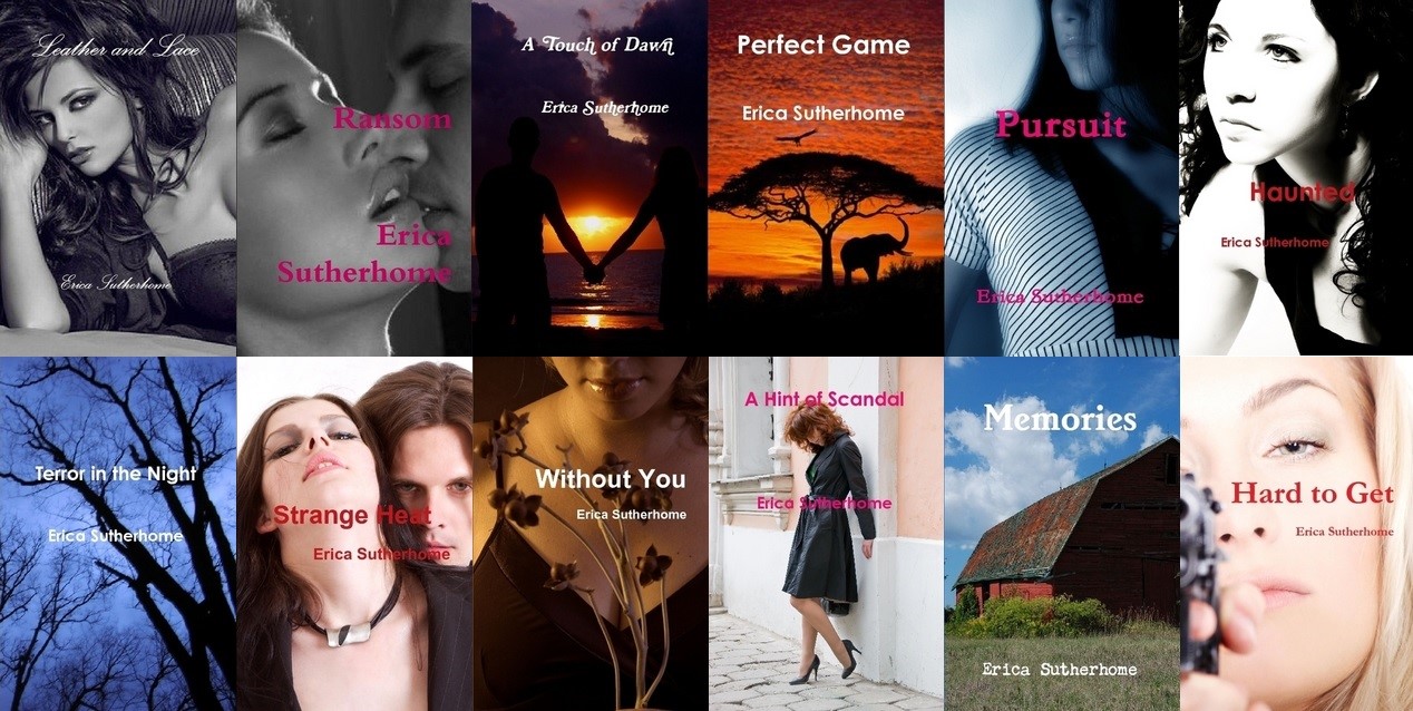 Erica Sutherhome: Hard to Get; Memories; A Hint of Scandal; Without You; Strange Heat; Terror in the Night; Haunted; Pursuit; Perfect Game; A Touch of Dawn; Ransom; Leather and Lace